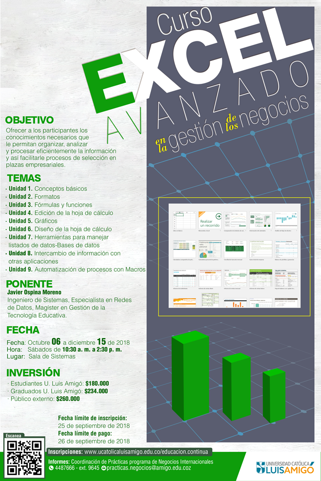 Este curso, brinda los conocimientos y habilidades que le permitirán al participante adquirir un amplio dominio en el análisis, diseño, organización y presentación de información administrativa de oficina, generación de reportes efectivos, cruce de información y análisis de los datos. De igual manera el participante conocerá el manejo de macros y la automatización de procesos repetitivos para mejorar la disponibilidad en la información su eficiencia y su eficacia.